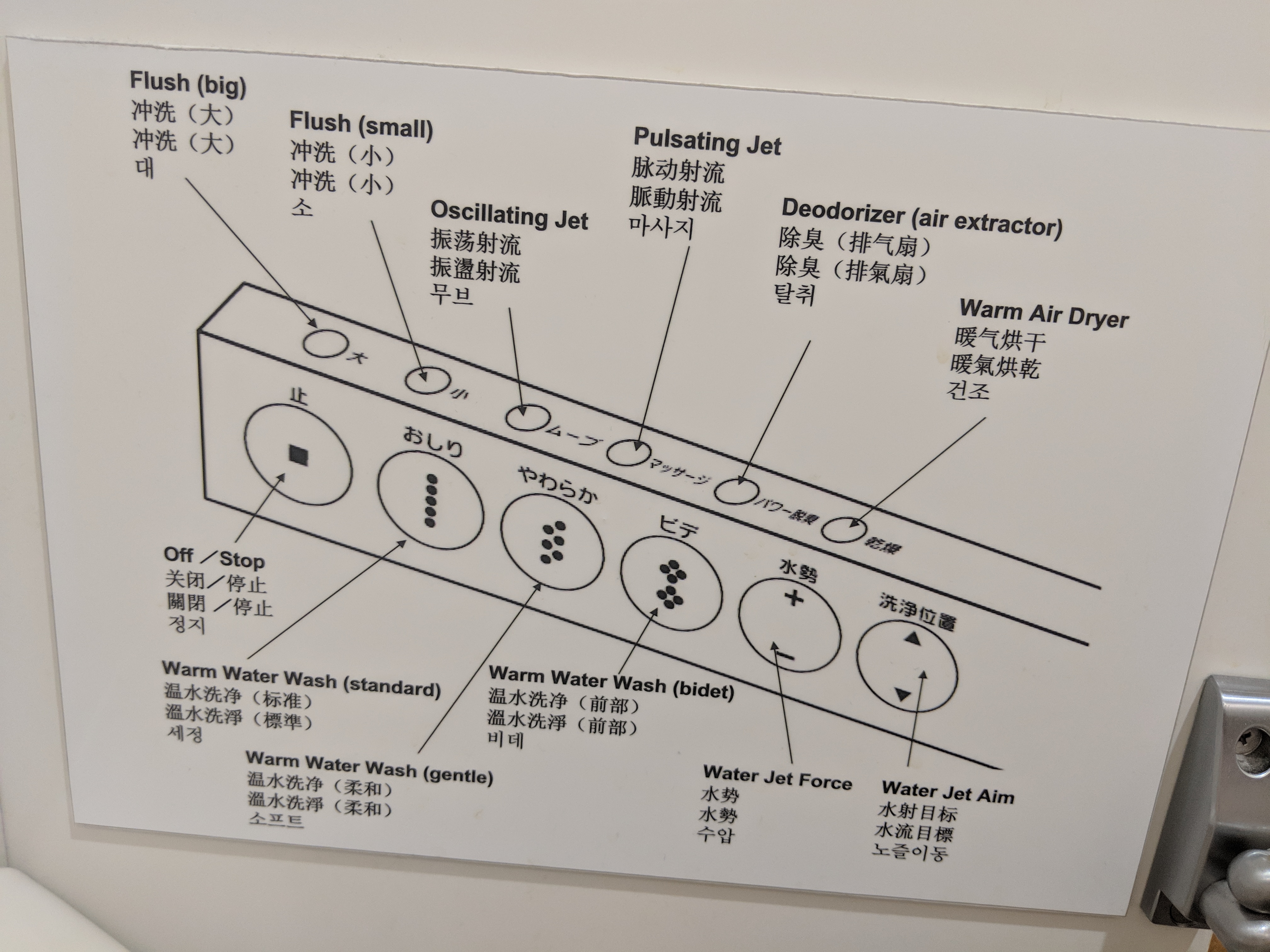 These were taken in different bathrooms in Tokyo and Kobe. Japanese toilets are no joke – RTFM! I have to say that these pics make things seem way more complicated than they are. As an option, if you want to be more minimalist, some public bathrooms also offer a hole in the floor. Yep that was a bit of a culture shock for me! Brings new meaning to the term “squatty potty”…or well, actually old meaning? Whatever, you know what I mean!