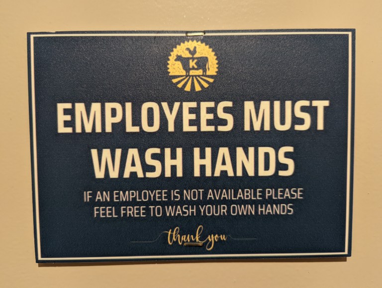 Why is it that I seem to find so many fun little signs in public bathrooms? Here, we have a new twist on the required signage in public bathrooms in Florida, which almost always just say “Employees must wash hands” – they are ubiquitous here. This one is at Keel Farms in Plant City – what can I say, I do appreciate a little clever word play!